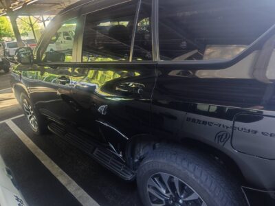 【ランクルプラド 塗装・修理】左リアドア新品パネルをルミナスクリヤーで美しく仕上げ|周南市