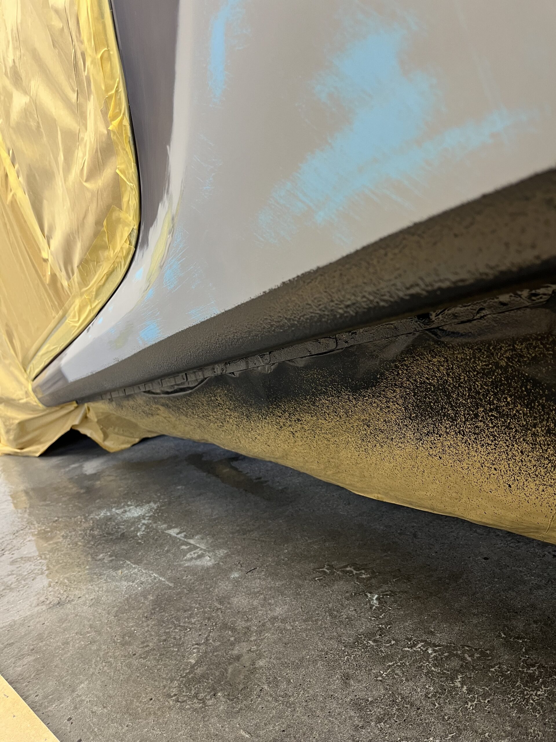 板金後にこのラインを適当に塗ってしまうと、横から見たときに段差ができて「直した跡」が丸見えになってしまいます。当店ではこのラインの高さや粒の大きさを新車時の状態に合わせることで、修理したことが分からない自然な足元を再現しました。