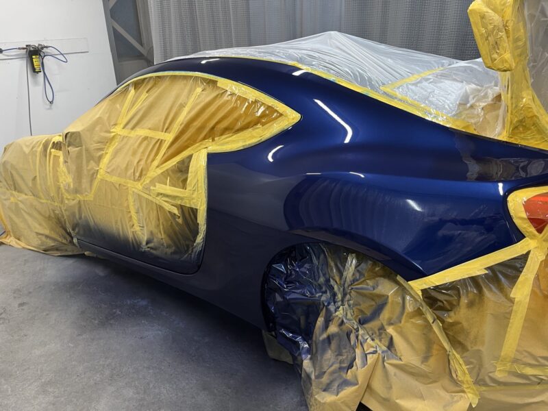 ブルーメタリックの調色は現車に合わせて微調整を行い、ボカシ技術を駆使して塗り上げることで、補修跡を感じさせない自然な一体感に仕上げています。
