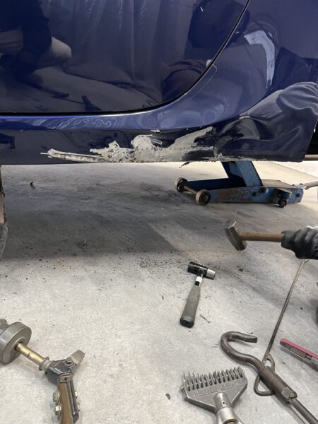 まずはステップからクォーターにかけての傷の深さを確認します。ハチロク特有の低いラインを崩さないよう、専用工具で鉄板をミリ単位で引き出し、元のシャープな造形をじわじわと復元していきます。