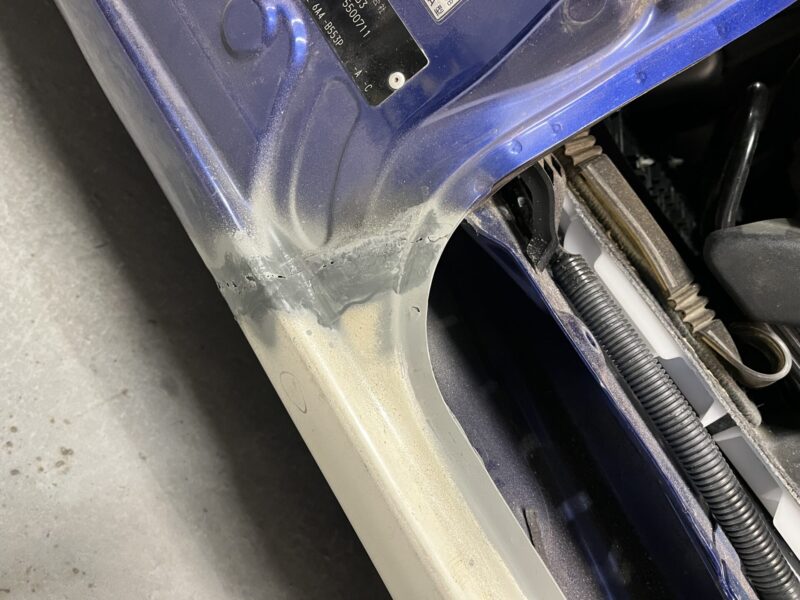 メーカー純正と同じ「スポット溶接」を再現し、事故前と同等の強度を確保。パテ研ぎ、サフ入れまで一切の妥協なく下地を完成させています。