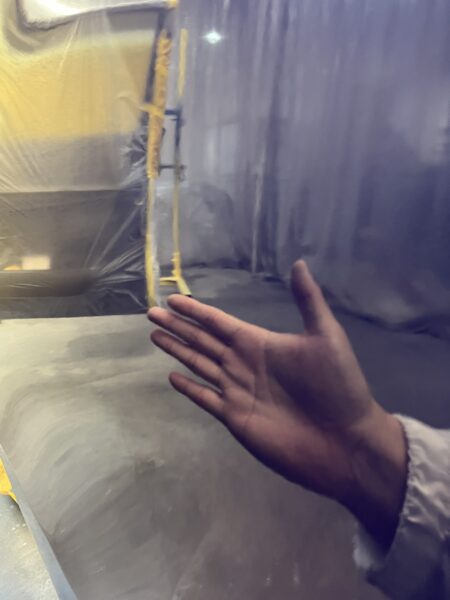 塗装の仕上がりを左右する埃やゴミを徹底的に排除するため、専用のブース内でボディを清掃・脱脂します。板金工程で仕上げたサフェーサーの状態を最終チェックし、塗料が100%の性能を発揮できる完璧な下地を整えます。