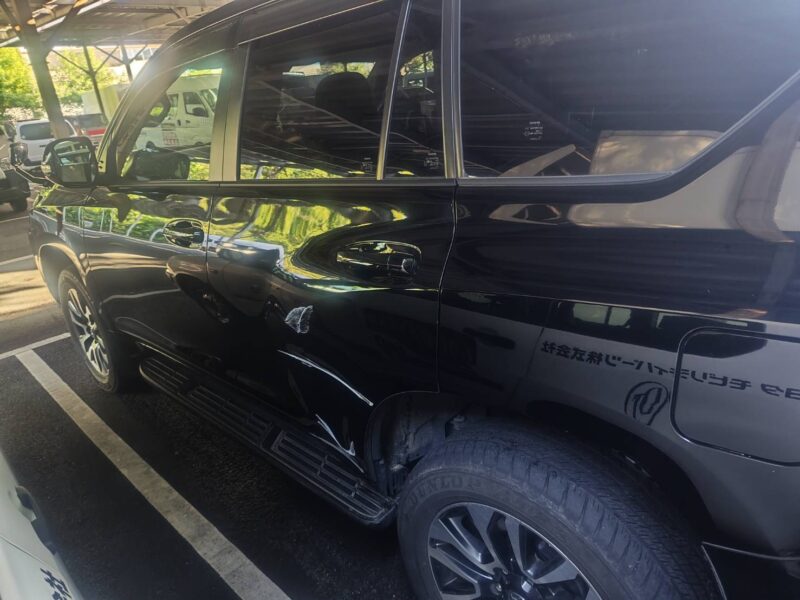 周南市にお住まいのお客様より、ランクルプラドの左リアドア新品パネル塗装をご依頼いただきました。SUVとして人気のランクルプラドは、アウトドアや日常使用でも目立つボディライン。今回は新品パネルを使い、ルミナスクリヤーで自然な艶感と美しい仕上がりを実現しました。
