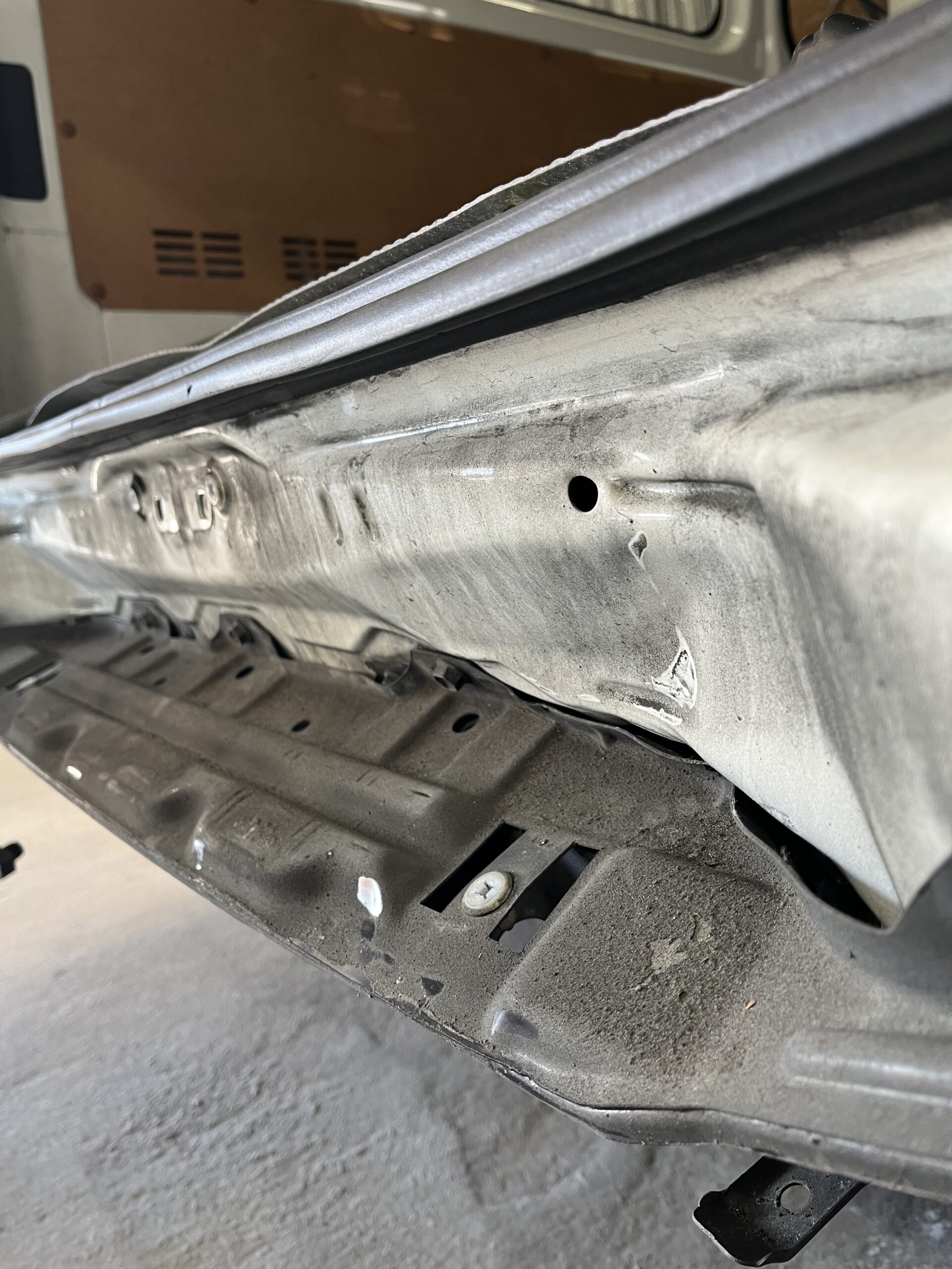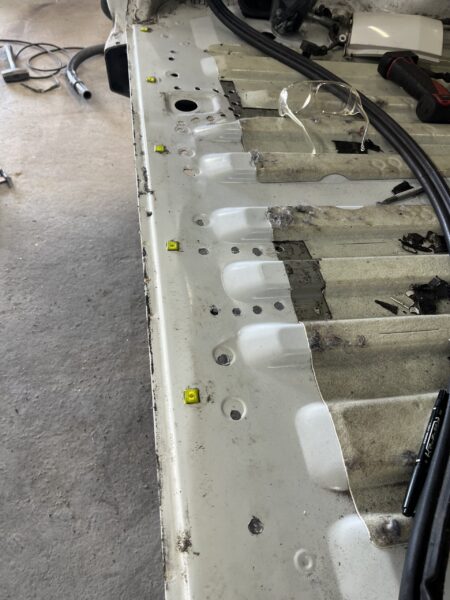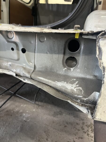 フレームが本来の位置に戻ったら、次はリアフロア(荷室の床)やインナーパネルの細かい波打ちを直します。ここを平らに戻さないと、内装パネルが浮いたり、雨漏りの原因になったりします。ハンマーと当て盤を使い、手作業でコツコツと元の滑らかな面に仕上げていきます。