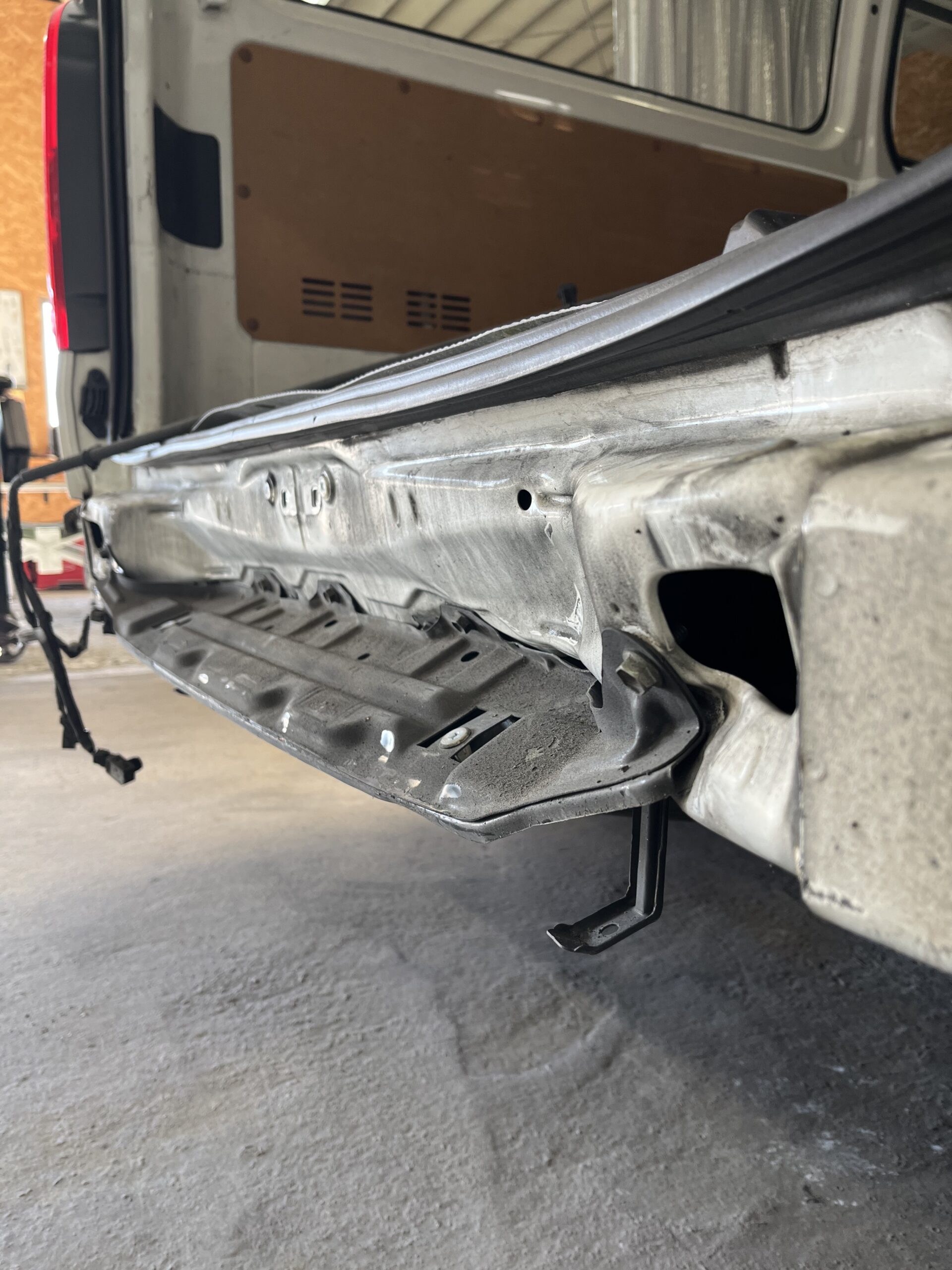 まずはリアゲートやバンパーを外し、外からは見えない内部(インナーパネルやフロア)の折れ・曲がりを徹底的に確認します。ハイエースは荷室が広いため、少しの歪みが全体のねじれに繋がります。どこまで衝撃が及んでいるか、まずは「芯」を特定することから始まります。