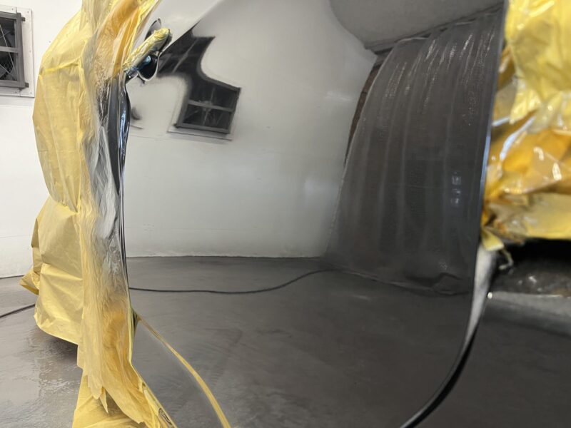 クリア塗装を用いて、ほぼ純正の塗装肌に合わせるよう慎重に塗装。バフ掛けも最小限に抑え、バフ目や小傷が出ないように仕上げました。周囲のパネルとの馴染みも自然で、違和感のない美しいボディに復元しています。