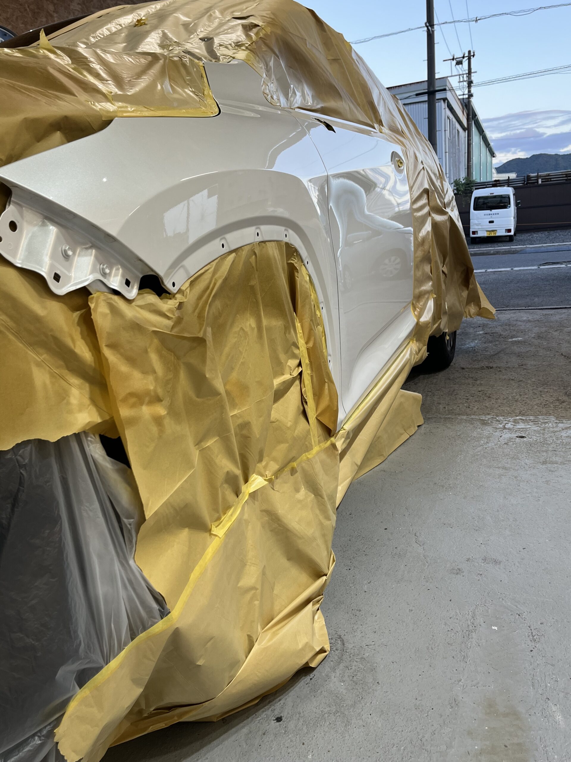 今回は損傷自体は軽度でしたが、3コートパール塗装特有の奥行きと輝きを再現するために入念な調色を実施しました。フェンダーからドア、サイドミラーまで繋がるラインを意識し、塗装面に段差や色ムラが出ないよう細心の注意を払っています。