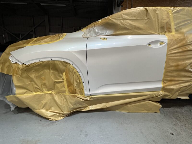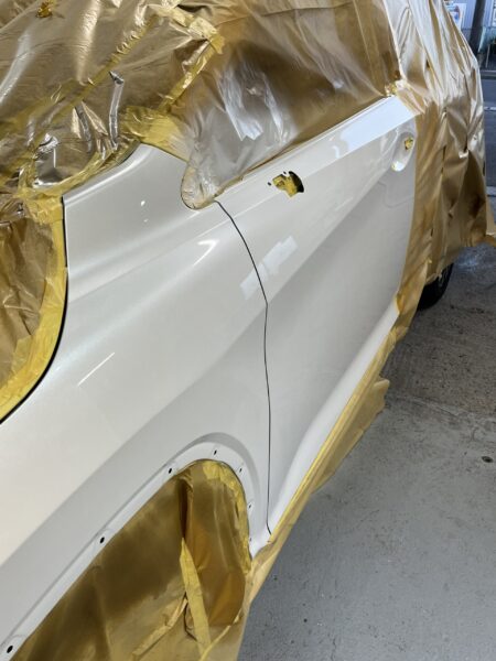 今回は損傷自体は軽度でしたが、3コートパール塗装特有の奥行きと輝きを再現するために入念な調色を実施しました。フェンダーからドア、サイドミラーまで繋がるラインを意識し、塗装面に段差や色ムラが出ないよう細心の注意を払っています。