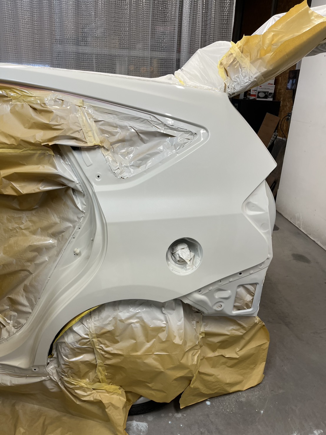 左クォーターパネルを新品部品に交換し、左リアドア、リアバンパー、リアゲートは板金塗装で修復。